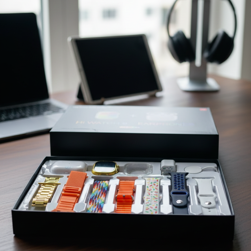 With itsย 11โinโ1 design, this smartwatch offers advanced features for health monitoring, connectivity, and entertainment, while ensuring durability and comfort. Perfect for tech enthusiasts, it combinesย modern design with practical accessoriesย for a seamless experience.